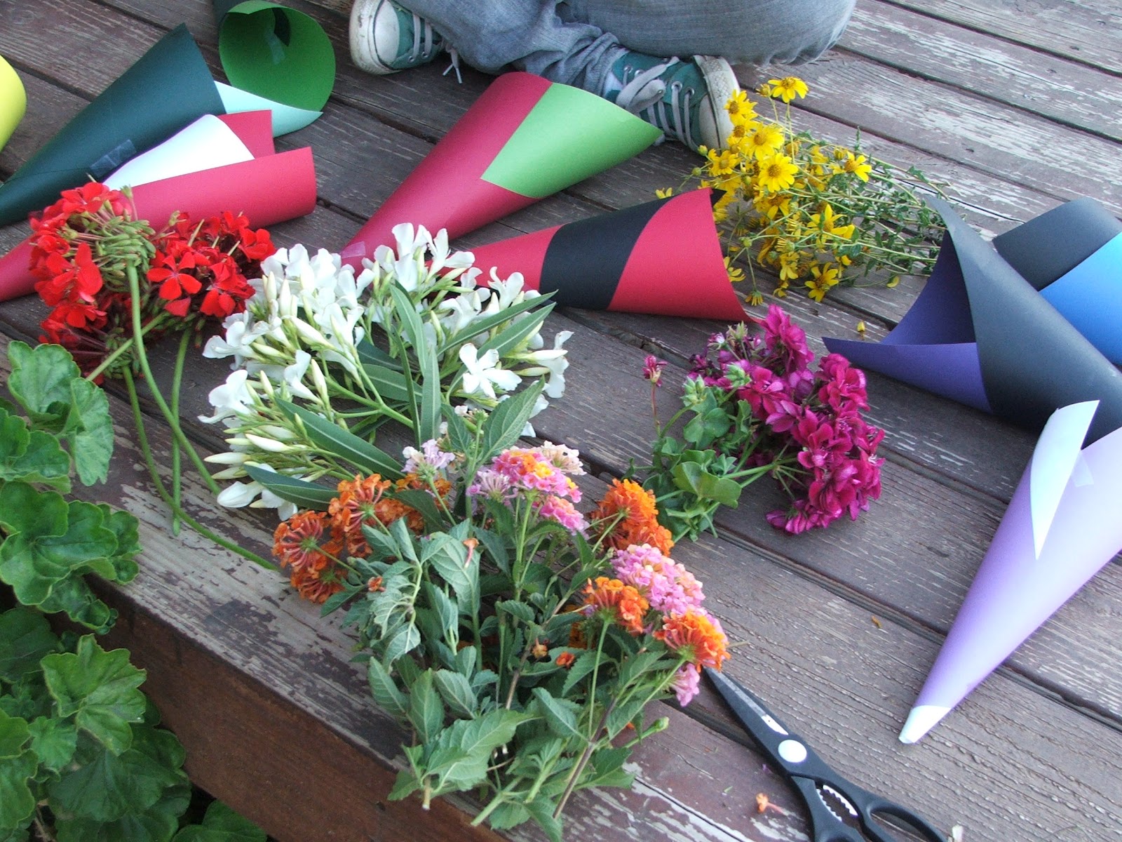 Make simple paper cones out of construction paper the night before. We taped two pieces of construction paper together and rolled them into cones, securing with a couple more pieces of tape. you could also look for baskets at thrift stores if you don’t want to make your own. Wake up early the next morning to cut flowers. We settled on my friend’s porch to arrange our flowers.