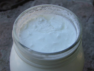 - While the milk is cooling remove the water and towel from the pot. Fill the two remaining jars with boiling water. Place them in the pot. Once the milk has cooled to 110 degrees F( this normally takes at least an hour), stir in 2 TBS of whole fat or greek yogurt into each jar. Screw on the lids and place in the same pot as the jars with the boiling water. Place the lid on the stock pot and cover with 4 kitchen towels to keep the heat in the pot. You want to keep the milk/yogurt at a consistent 110 degrees F until firm which takes from 4 to 24 hours. Change the water in the jars as needed. Keep the pot in the warmest location in the house as long as it does not raise temperature of the milk/yogurt above 110 degrees F. You will know that the yogurt is ready when it is slightly firm. The yogurt will keep in the fridge for about one month.
