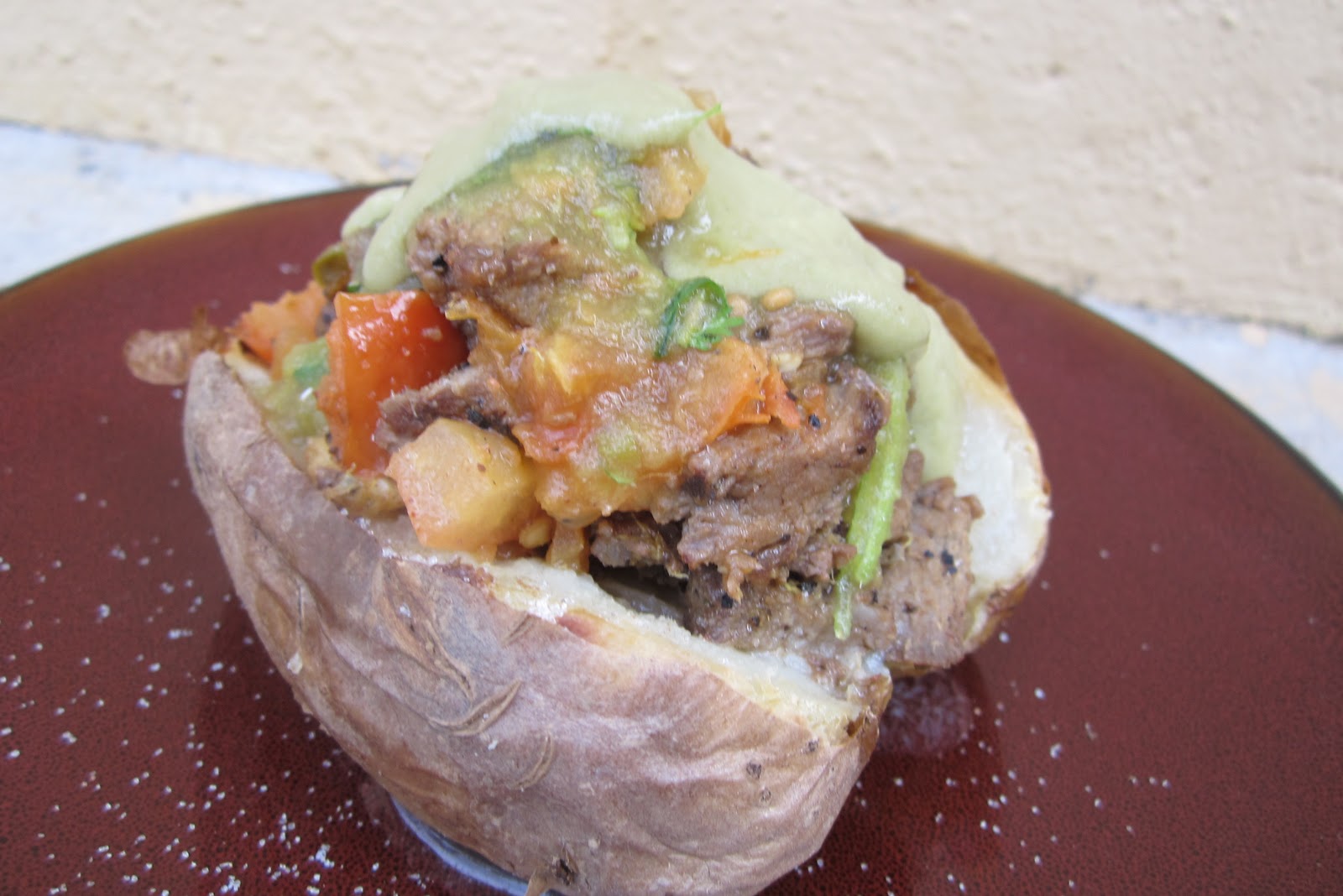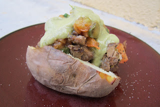 I used to like baked potatoes but since I’ve experienced the Mexican way of dressing them up there is no way I can go back to an American potato with plain old butter, broccoli, salt and pepper. After experiencing my first Mexican baked potato I’ve been dreaming about when I have one again. There are some awesome little restaurants in Ensenada that just make baked potatoes and tacos. These potatoes are like a taco served on top of a potatoes. There are all sorts of combinations like chicken and pineapple, carne asada and peppers, chirizo adobado and cheese. Then you top them with salsa, pico de gallo, fresh squeezed lime juice and guacamole. Yum! This week I finally got around to making one of these amazing loaded backed potatoes. The measurements aren’t exact, just pile on whatever you like. This is just how I like to make them. Believe me once you have one you won’t be able to go back either.